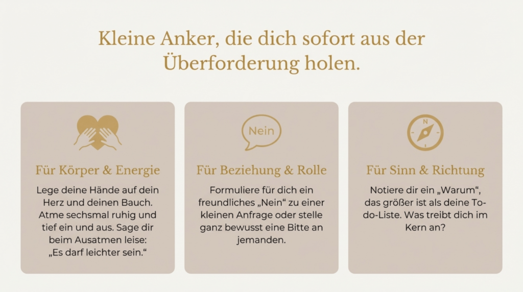 Diese drei Schritte wirken wie kleine Anker. Sie helfen dir, wieder bei dir selbst anzukommen – und aus der ständigen Überforderung auszusteigen. Stück für Stück. Atemzug für Atemzug.