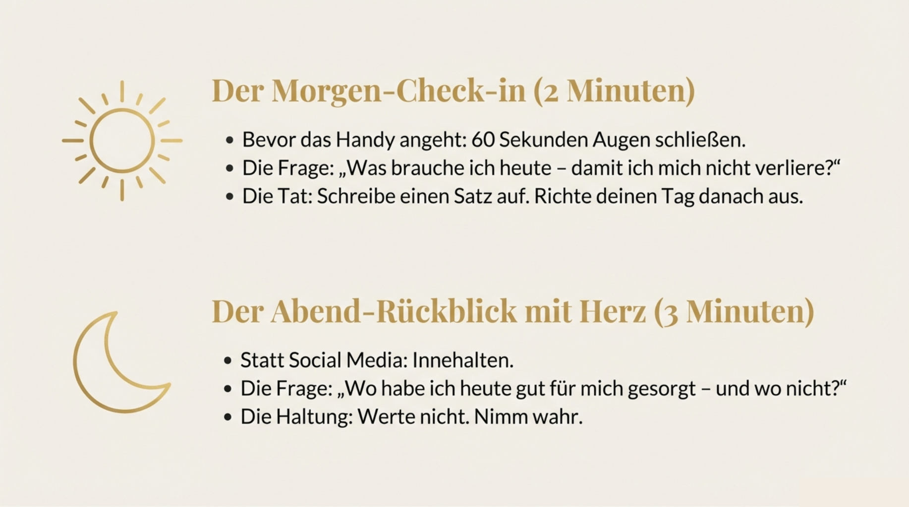 Weil sie gezielt gesetzt sind. Es sind nicht 2-3 beliebige Minuten, sondern fokussierte Momente mit Wirkung – morgens zur Ausrichtung und abends zur Integration.
